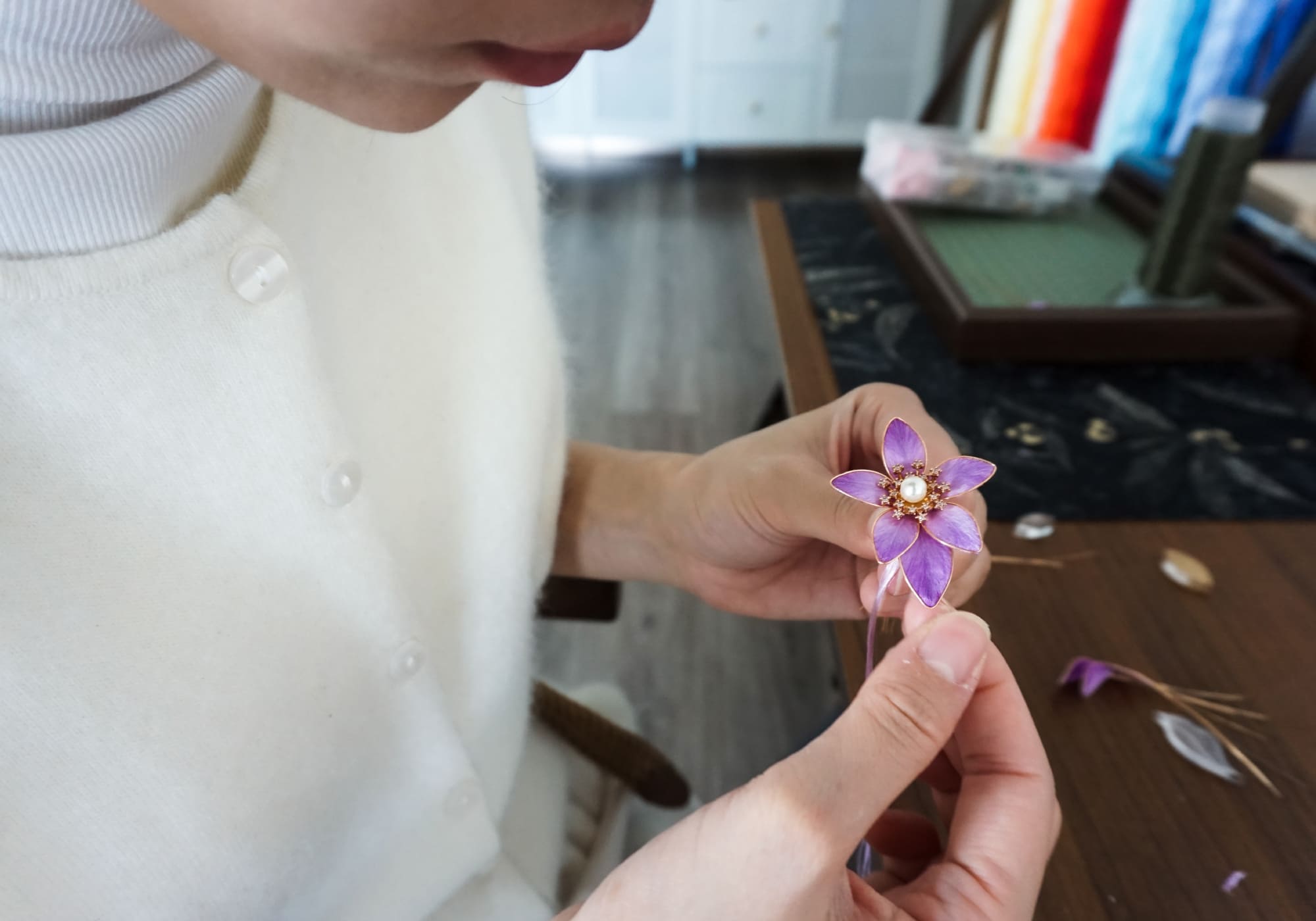 In her studio, Aria spends countless hours shaping petals, dyeing fabric, and assembling flowers one by one. She believes that handmade items carry a warmth that machines cannot replicate — a quiet emotion that people can feel the moment they touch it.